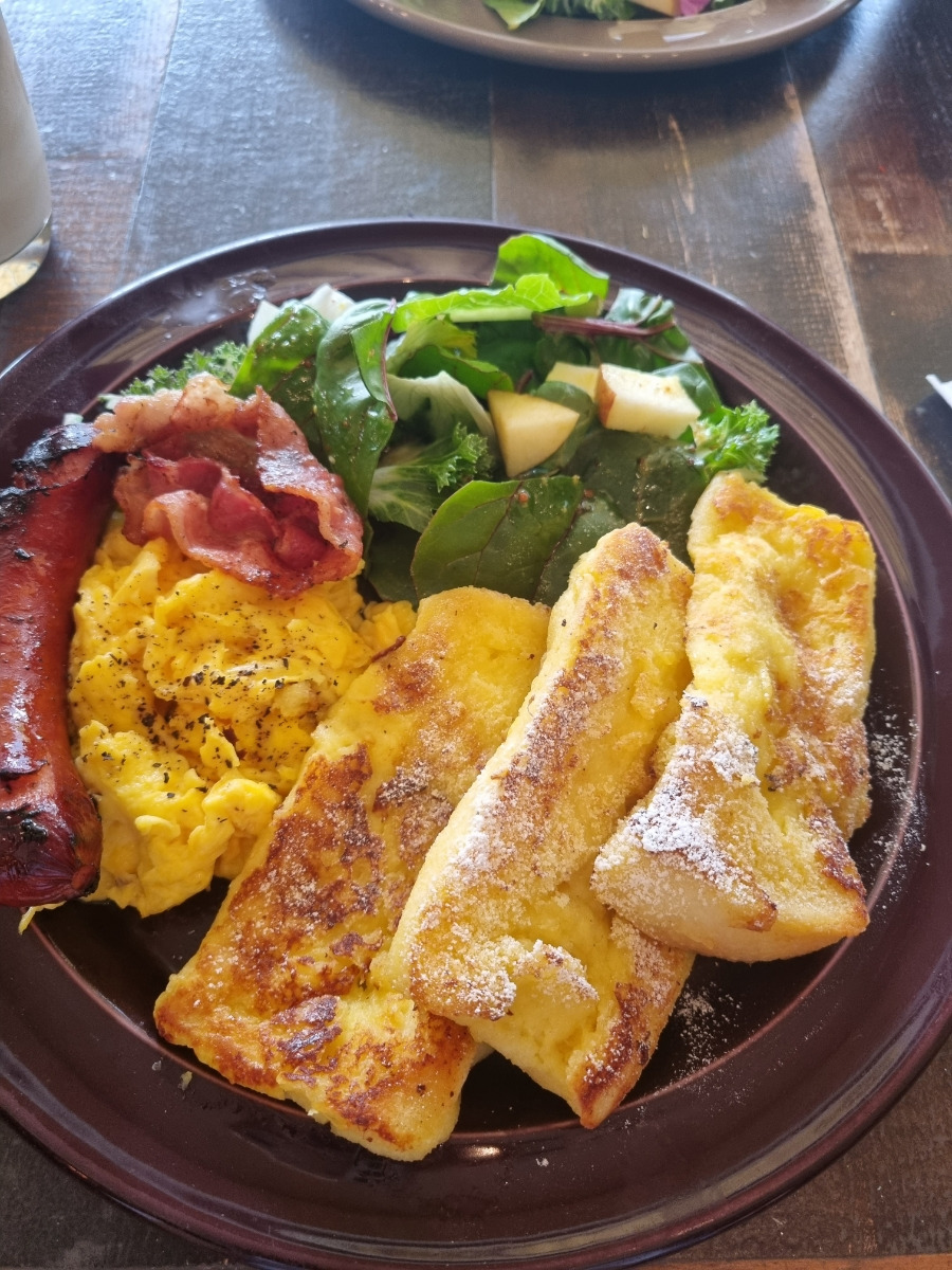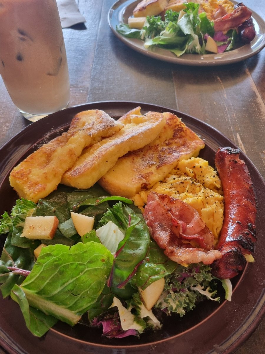 - 샐러드, 스크램블 에그, 소시지 등 다양한 재료로 구성된 완벽한 브런치 메뉴입니다.