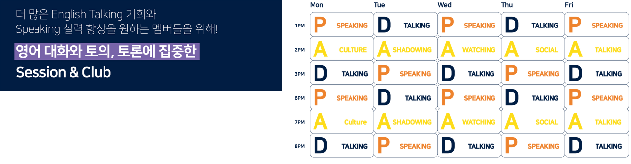 조이랜드는 처음 태블릿 미니로 레벨테스트를 진행한다. Reading, Listening, Writing 테스트를 보고 해당하는 레벨에 따라 참여할 수 있는 수업에 차이가 있다. 레벨은 Passport > Departure로 아래 시간표에서 P라 적혀있는 건 Passport 레벨 대상, D는 Departure 레벨 대상, A는 all 모든 레벨 대상으로 참여할 수 있는 그룹 세션이다. 나는 D레벨이 나왔고, 참여해본 수업은 A watching과 D talking이다.