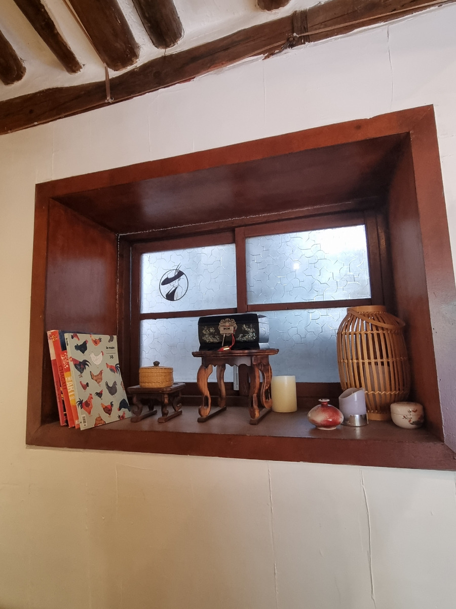 - 전통 소품과 목조 서까래가 주는 고즈넉함