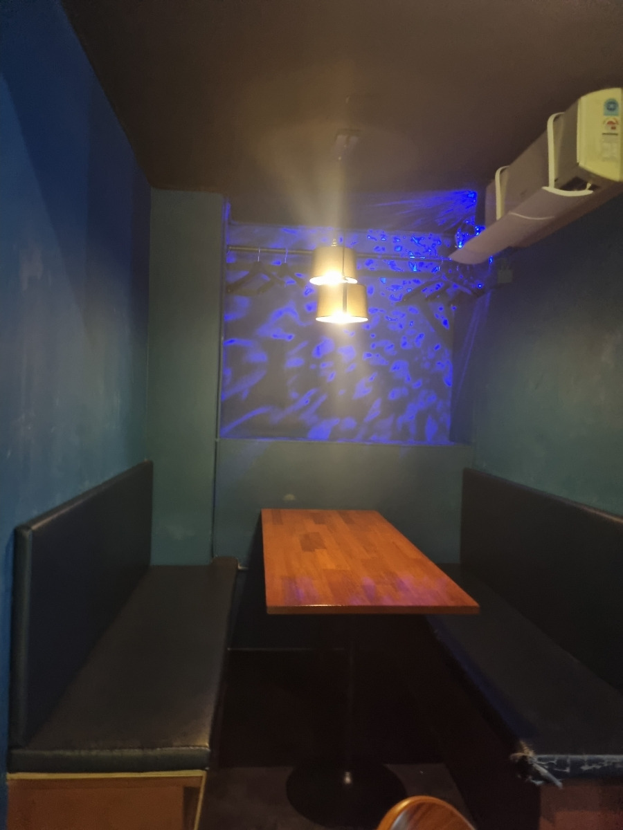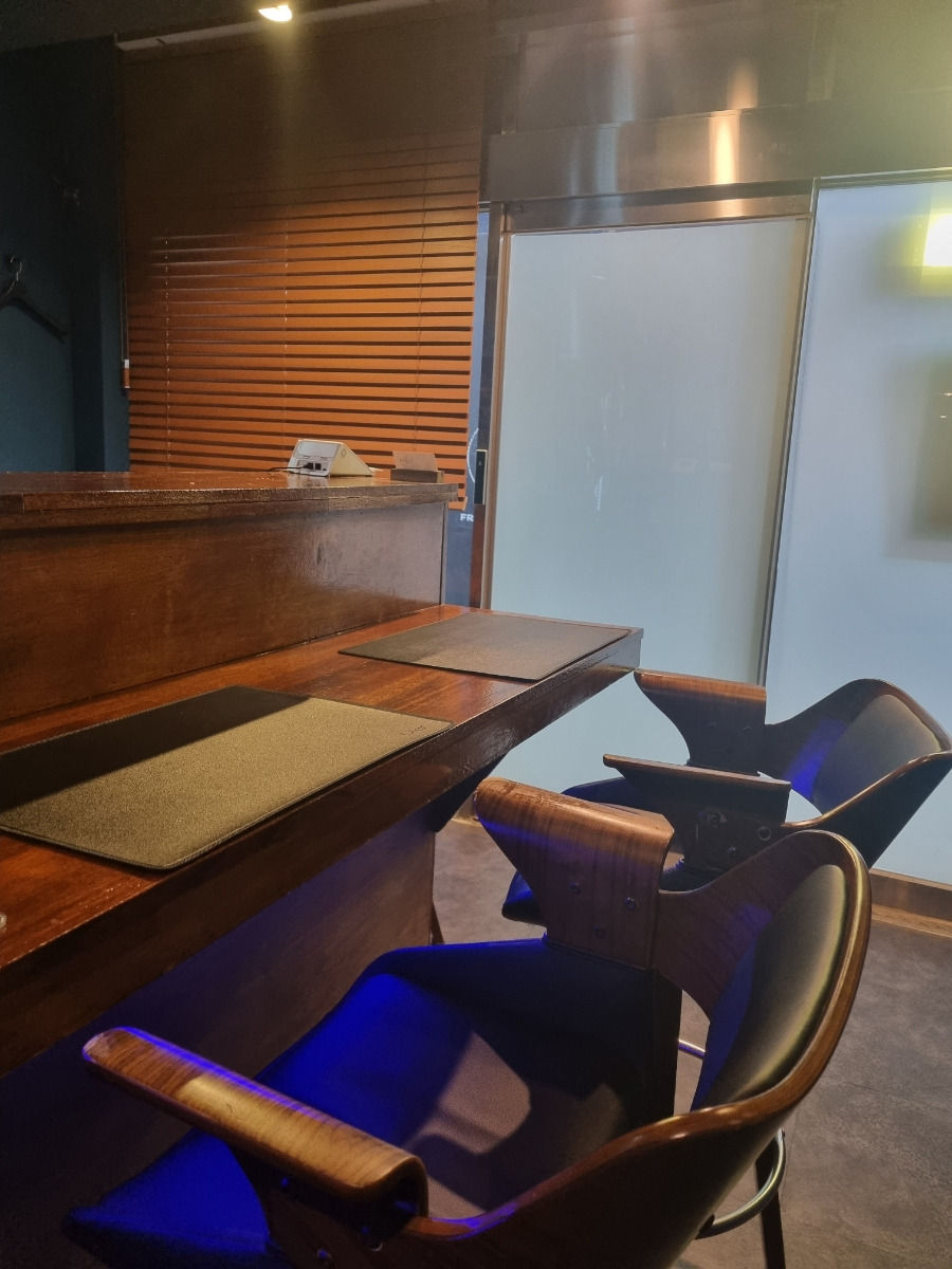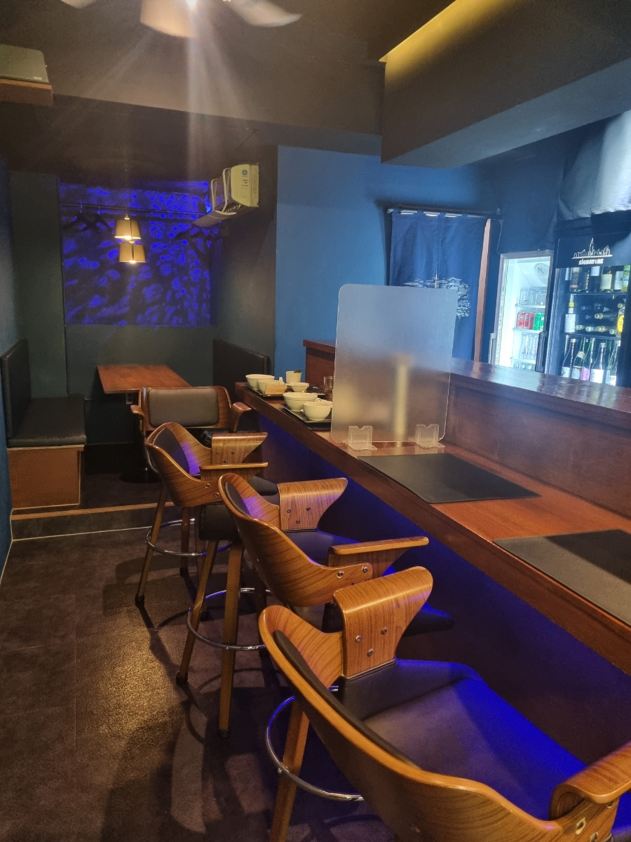 내부는 어둡고 아늑하며, 바 좌석 위주의 소규모 이자카야입니다.