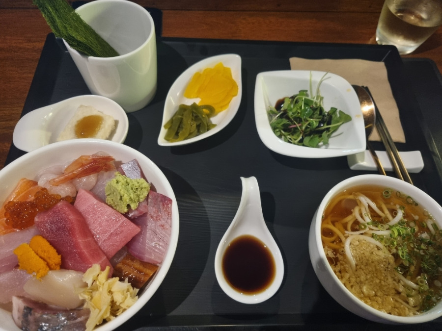 - 구성: 카이센동 + 샐러드 + 냉우동 + 두부튀김 + 감태