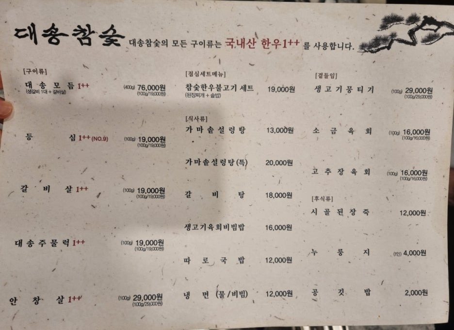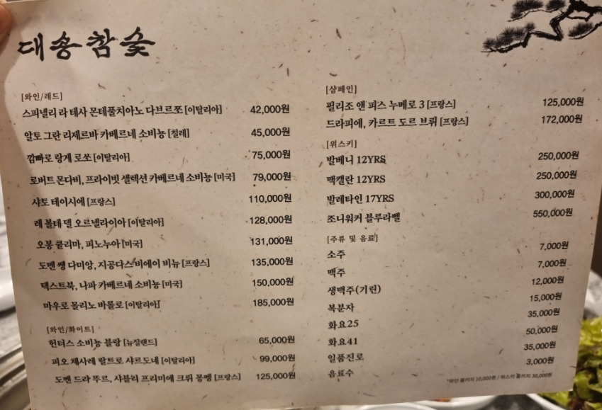 - 와인(42,000원) 판매, 한우와 함께 즐길 수 있음