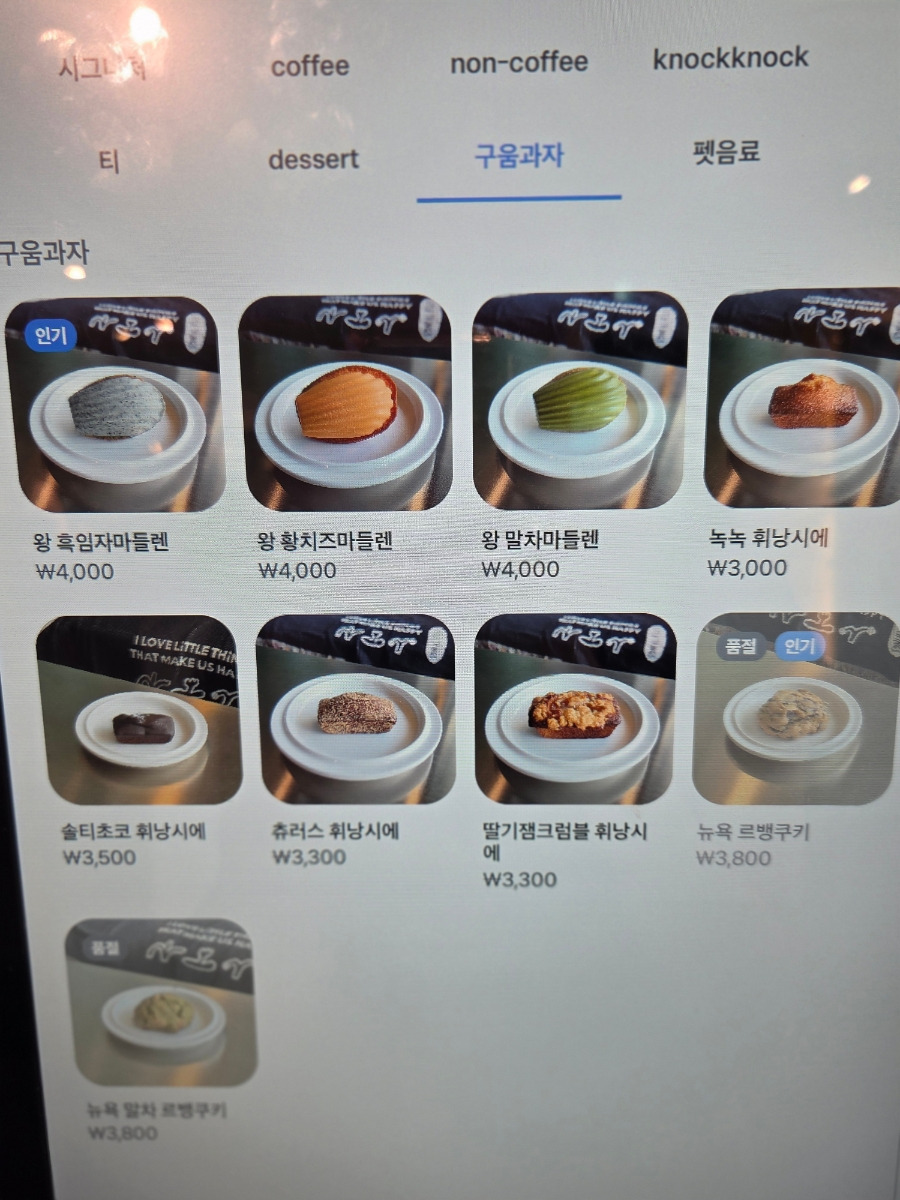 - 제커피, 티, 디저트(휘낭시에, 르뱅쿠키, 마들렌 등) 판매