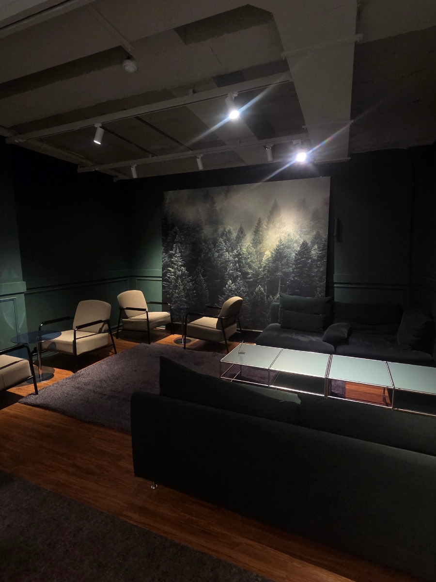 어두운 초록 벽과 숲 그림이 어우러진 공간이에요.