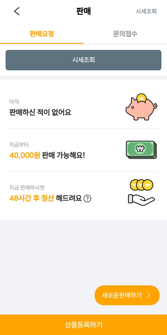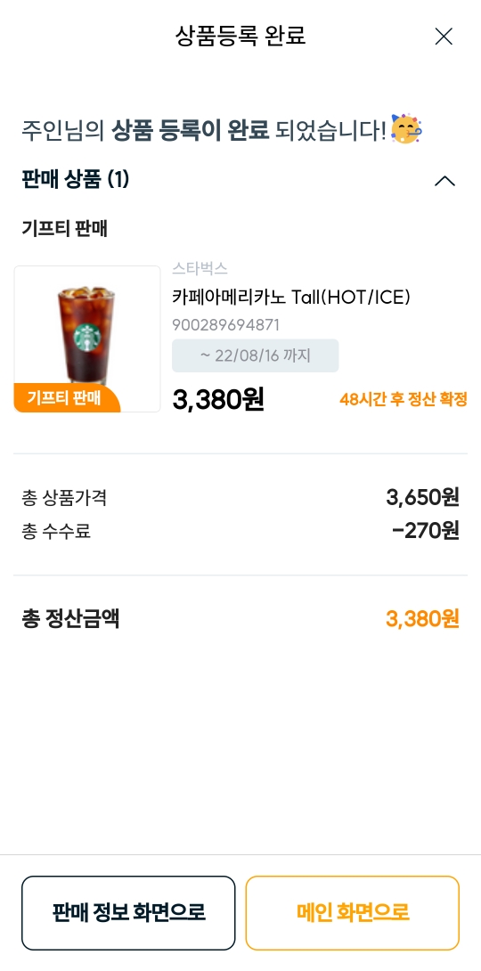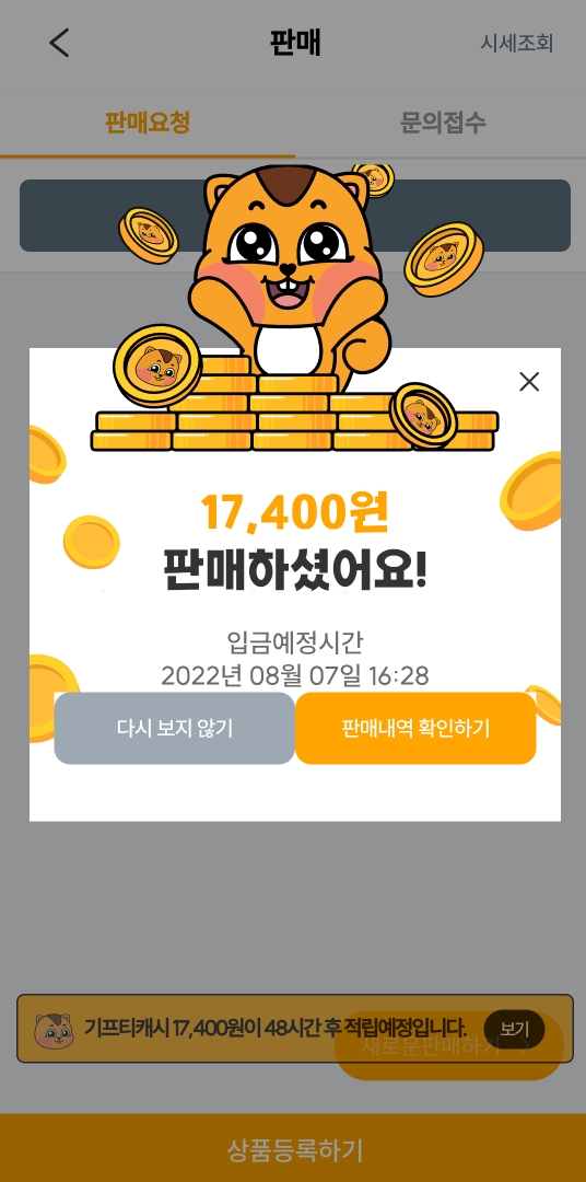 상품 등록하기를 누르고 기프티콘 이미지를 등록하면 바로 판매 가격이 나온다! 그걸 기프티스타 측에서 매입할 건지, 판매자가 승인할 건지 순차적으로 버튼을 누르면 판매 끝! 정산금은 48시간 뒤에 기프티캐시로 적립된다. 또한 정산 시간은 판매 금액, 판매한 상품에 대한 신고비율, 가입일 등을 종합해 개별적으로 안내된다고 하니, 꾸준히 활동하면 더 빨리 정산받을 수 있는 듯하다.