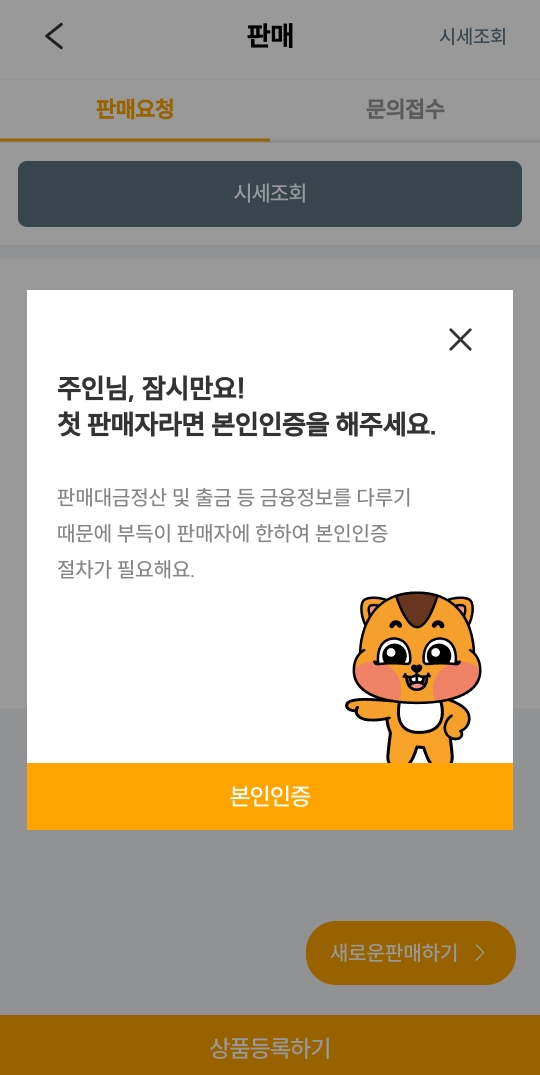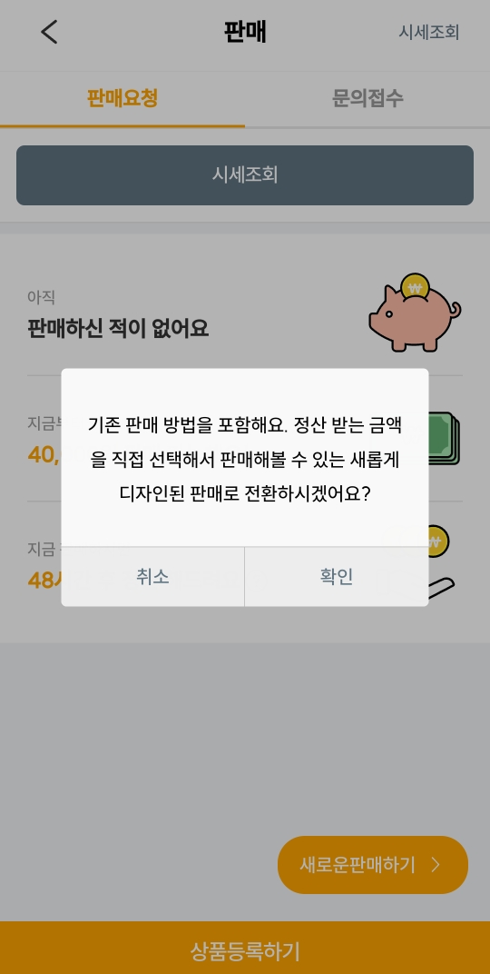 일반 판매로 판매하는 방법은, 하단의 판매탭에서 안내 팝업이 뜰 때 "확인"을 누르거나, 아래의 "새로운 판매하기"를 누르면 된다. 기프티콘을 올리는 방법은 기프티 판매와 마찬가지로 사진으로 올리게 된다.