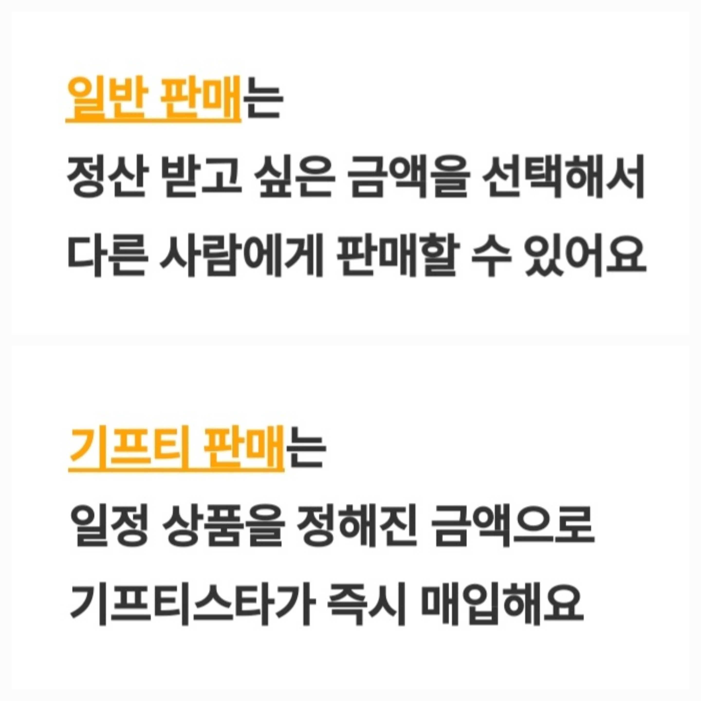 쉽게 말하면 기프티판매는 기프티스타 업체가 우리에게 싸게 사들이고 고객들에게 판매하는 대량구매 소량판매의 느낌이라면, 일반 판매는 다른 기프티콘 매매 플랫폼처럼 내가 원하는 금액대에 올리고 그 금액대를 원하는 사람 개개인이 구매하는 것이다. 따라서 판매와 구매 사이에 시차가 발생할 수 있다. 나는 오늘 올렸는데 그 금액대에 원하는 소비자가 1주일 뒤에나 나타나면 1주일 뒤에 팔고, 정산은 또 그로부터 48시간 후에야 가능한 것이다.