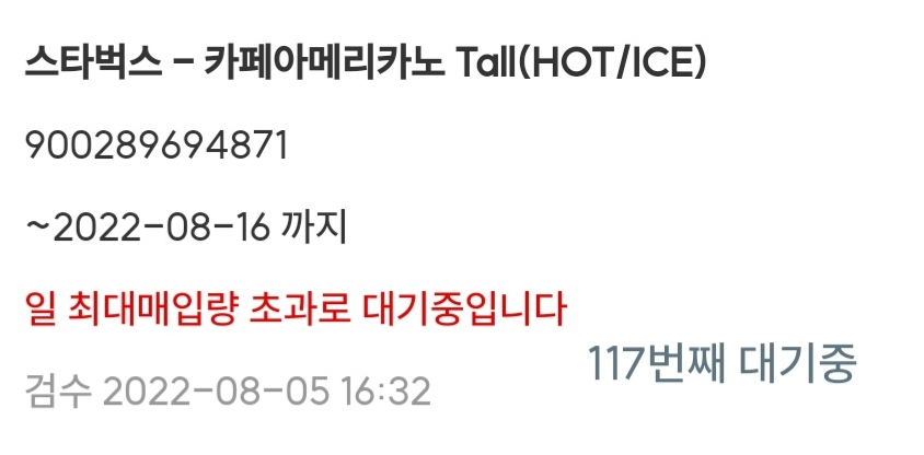 그러나 좀 공급이 많은 기프티콘의 경우 당일 한정수량처럼 기프티스타가 매입할 건지의 추가적인 대기가 있다. 근데 나는 117번째 대기였어도 당일에 매입되기는 했다. 시기에 따라 다른 듯.