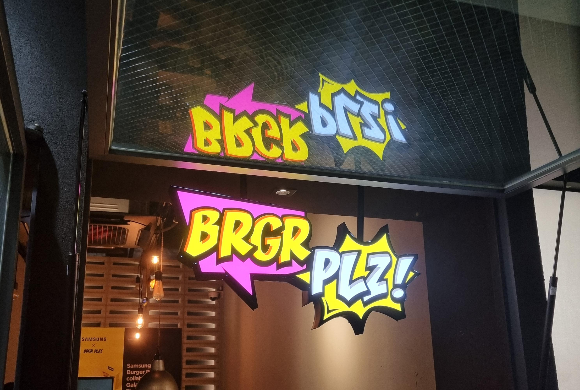 롯데캐슬 지하에는 큰 식당들은 주로 아재입맛이고 힙한 작은 식당들이 들어와있다. 버거플리즈 여의도점 역시 구석탱이에 있는 굉장히 좁은 가게로 내부에는 7팀 정도 앉을 수 있는 공간이다. 그 중 2자리는 바깥을 보는 바(bar)자리. 밖에도 4인 3개 테이블 정도 앉을 수 있다.