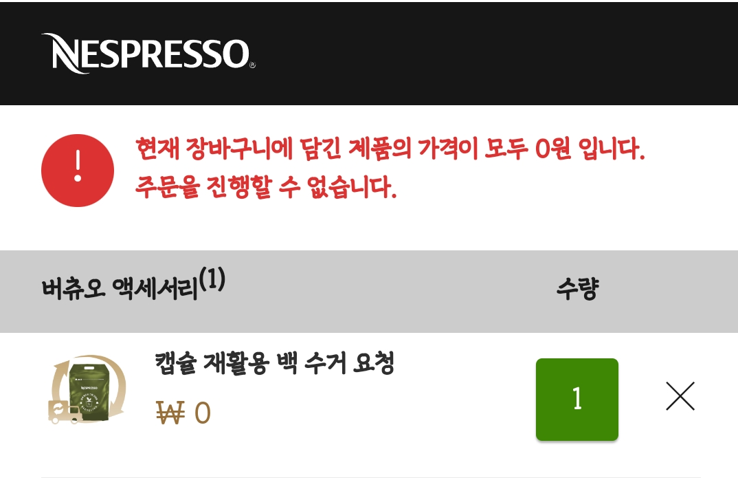 네스프레소 홈페이지에 커피캡슐을 새로 주문할 때 수거 요청과 새로운 재활용 백 주문을 같이 하면 된다! 네스프레소는 주문 금액이 0원을 초과해야 주문할 수 있기 때문에 재활용 백만 주문하거나 수거 요청만 하는 건 불가능하다.
